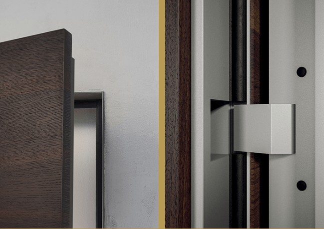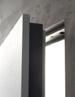 El marco de pared excluye cualquier acabado, mejorando la limpieza de líneas coplanadas y el diseño del producto. La cerradura está predispuesta para cilindro europeo ofreciendo siempre la máxima seguridad. Posibilidad de solicitar a la carta el protector oculto y tirador encastrado.